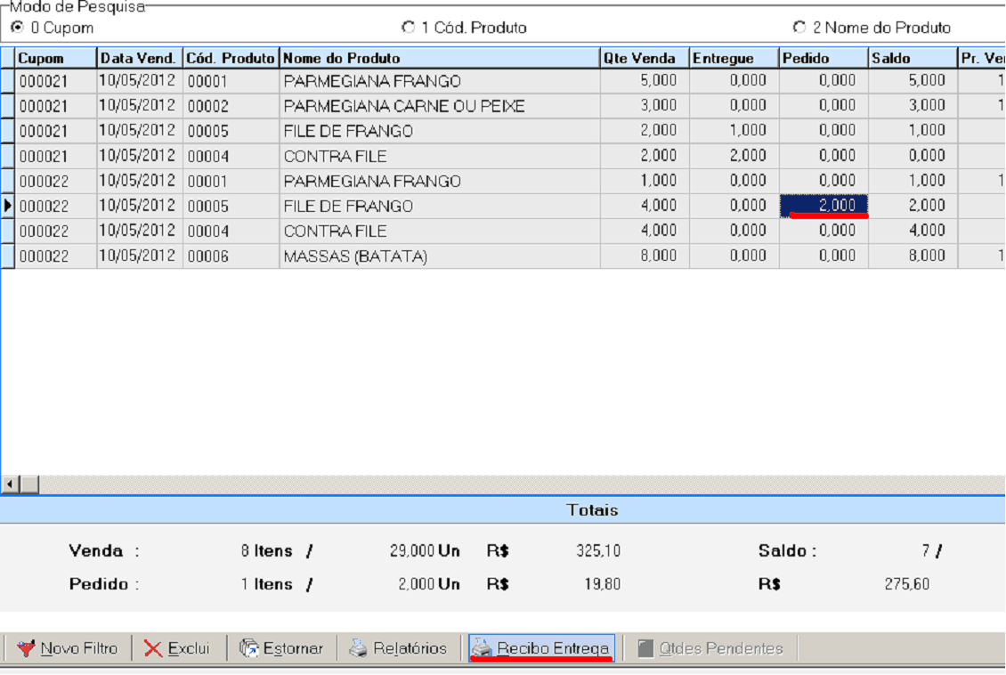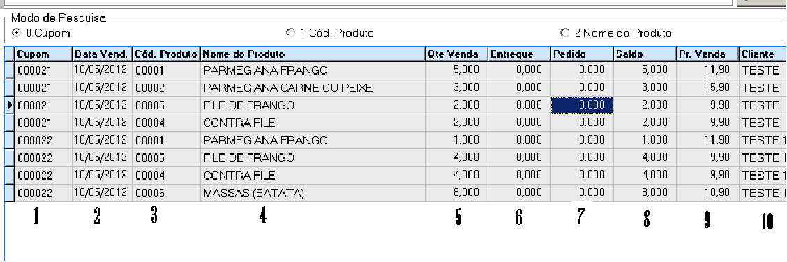 1-Cupom: É o numero do cupom que foi realizada a venda 2-Data Vend.: A data que foi realizada a venda 3-Cód. Produto: O códdgo do prdduto 4-Nome do Produto: O nome de cada Produto 5-Qte Venda: Quantidade de venda 6-Entregue: Quantidade de produtos entregues 7-*Pedido: A quantidade que iremos selecionar para serem entregues 8-Saldo: Quantos produtos ainda faltam para serem entregues 9-PR. Venda: O preço de venda dos produtos 10-Clientl: O cliente omde será entregue a mercadorea