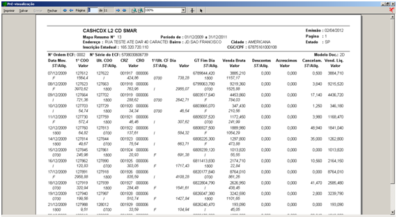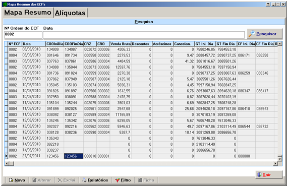 Todas as informações constantes na tabela estão impressas na Redução em Z do dia correspondente. Então caso você precise fazer uma manutenção, tenha em mãos a Redução em Z dos dias correspondentes.