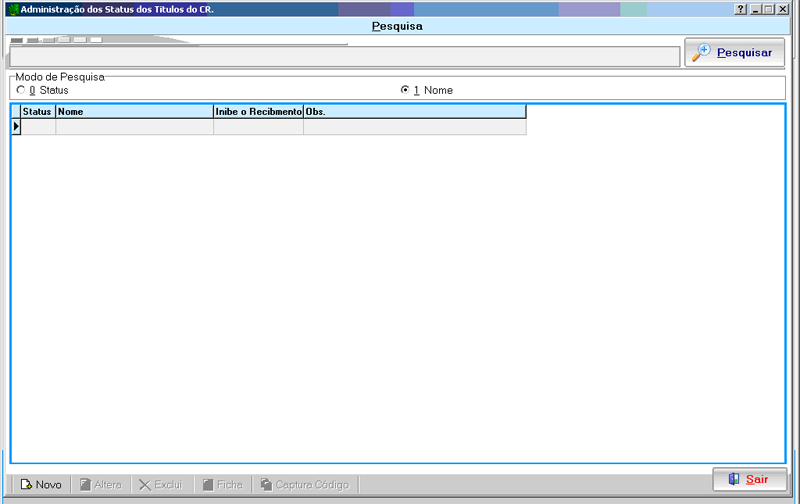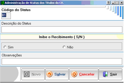Status dos títulos do CR é uma tabela de estados que permite você associar aos títulos do CR (Contas a Receber). Exemplos Título Protestado Título Enviado para Cobrança etc...