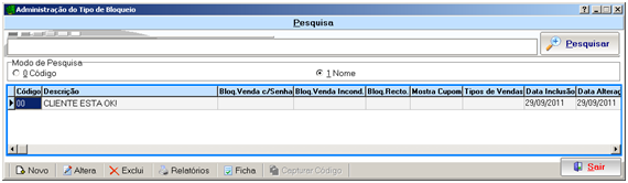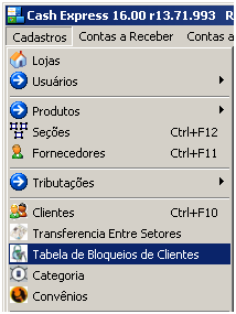 Visualizando o menu de Tabela de Bloqueios de Clientes: