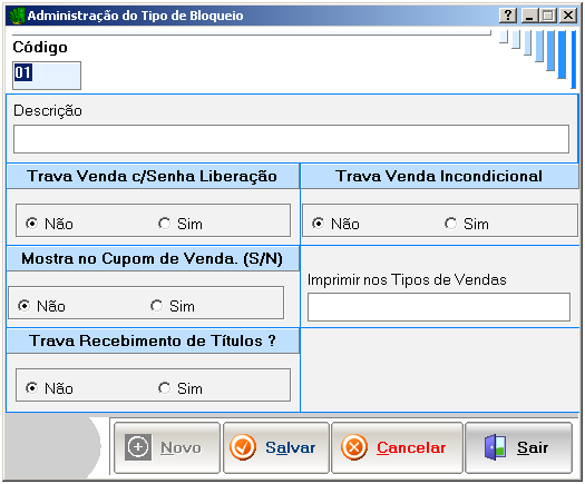 Trava Venda Incondicional: Sim: irá travar a venda, sem possibilidade de vender para esse cliente. / Não: permite a venda normalmente.