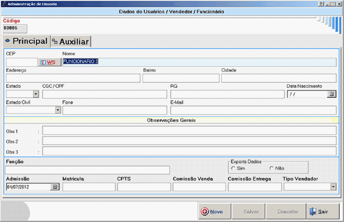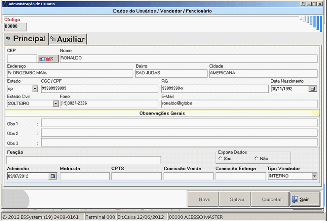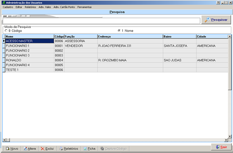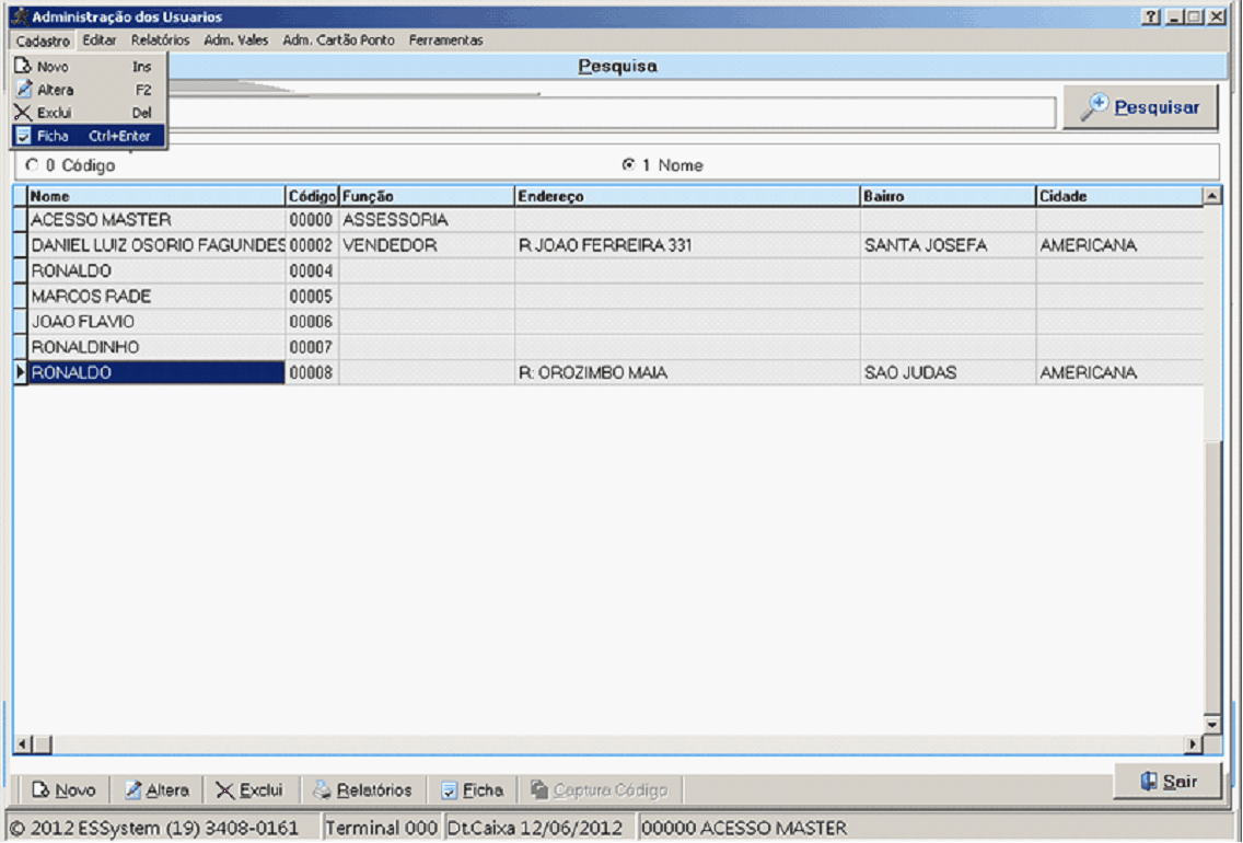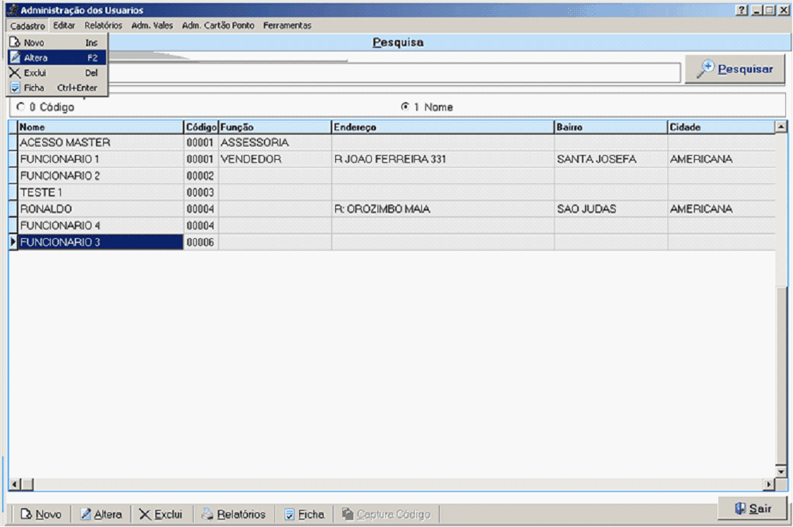 Para alterar o cadastro de um usuário, Cadastro -> Altera usuário ou Pressione a tecla F2.