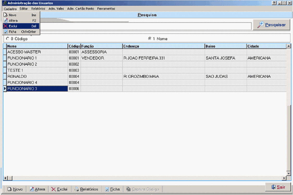 Para excluir um usuário, selecione o usuário clique em Cadastro -> Excluir, ou Pressione a tecla DEL.
