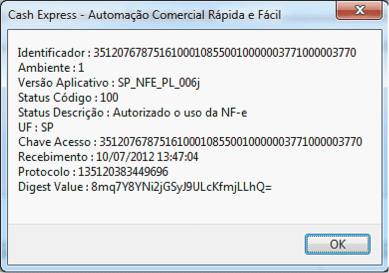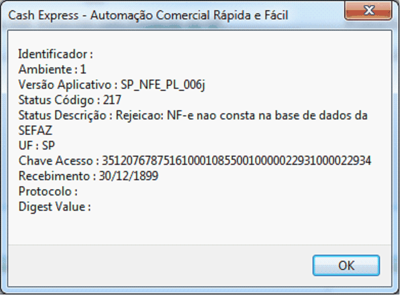 Com base nessa resposta você saberá se a Nota Fiscal existe na base de dados da SEFAZ ou não clique em OK para fechar a janela de dialogo.