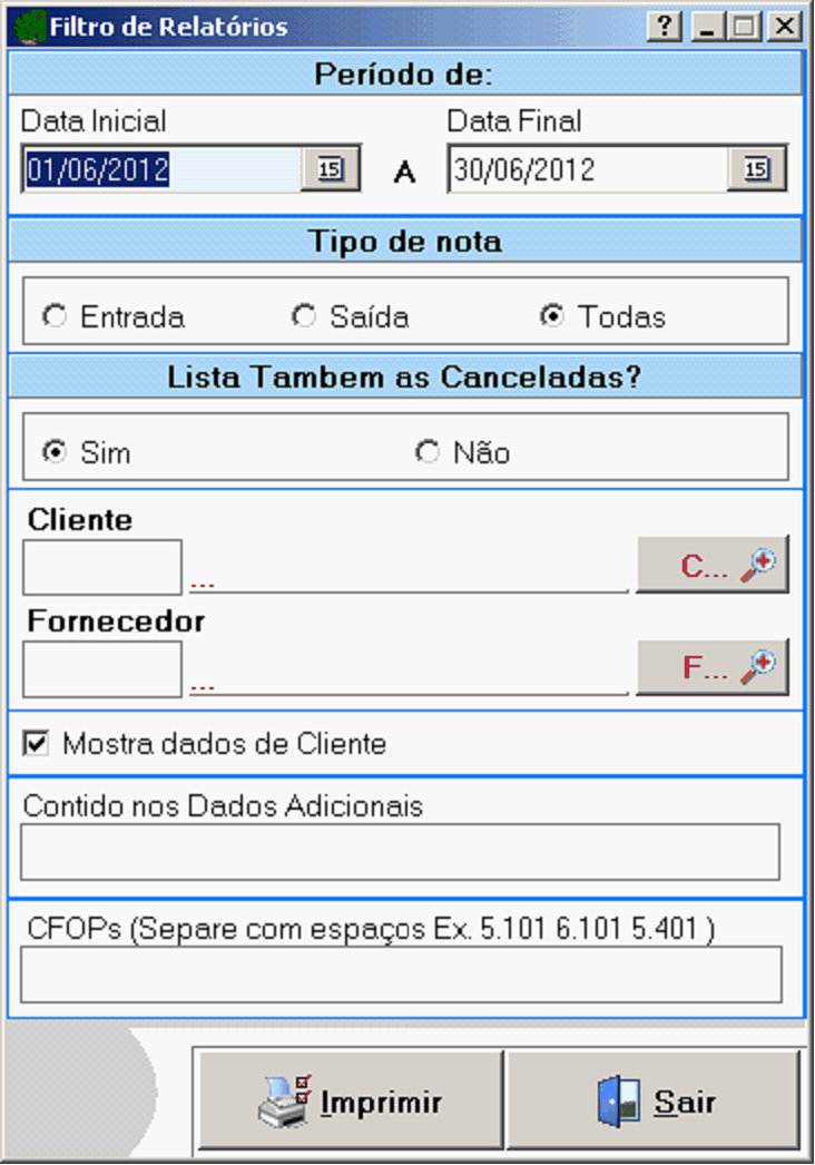 •Entrada •Saída •Todos Lista também as caaceladab: Defina se irá listar no relatório as NF-e canceladas;
