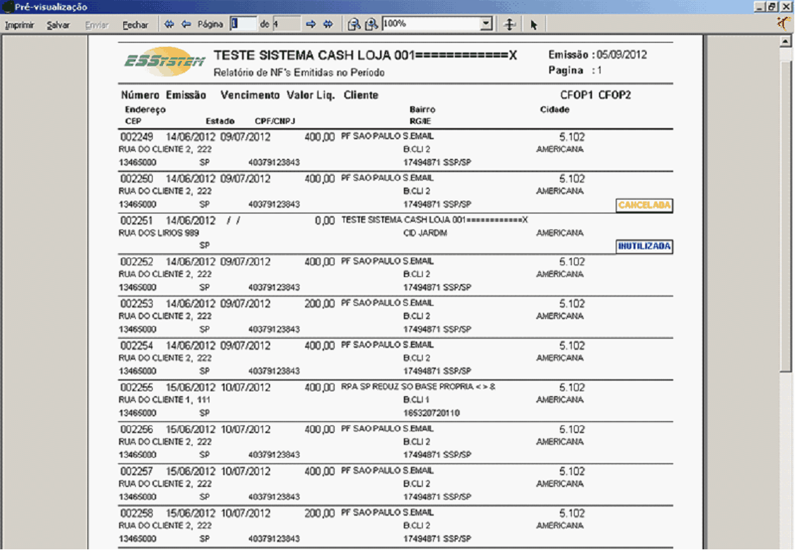 No examplo abaixo temos um relaoório das NF-e emitidas, mostrará o cliente, boirro, número da NF-e, endereço, e etc;