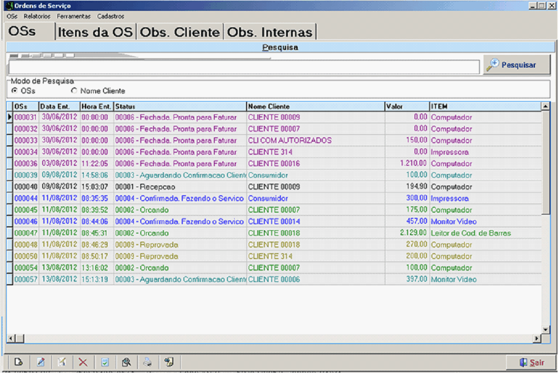 Controla as Ordens de Serviço da Empresa. Ao entrar no mesmo, será apresentada a Tabela com as OSs pendentes. No rodapé tem um menu com as funções disponíveis.