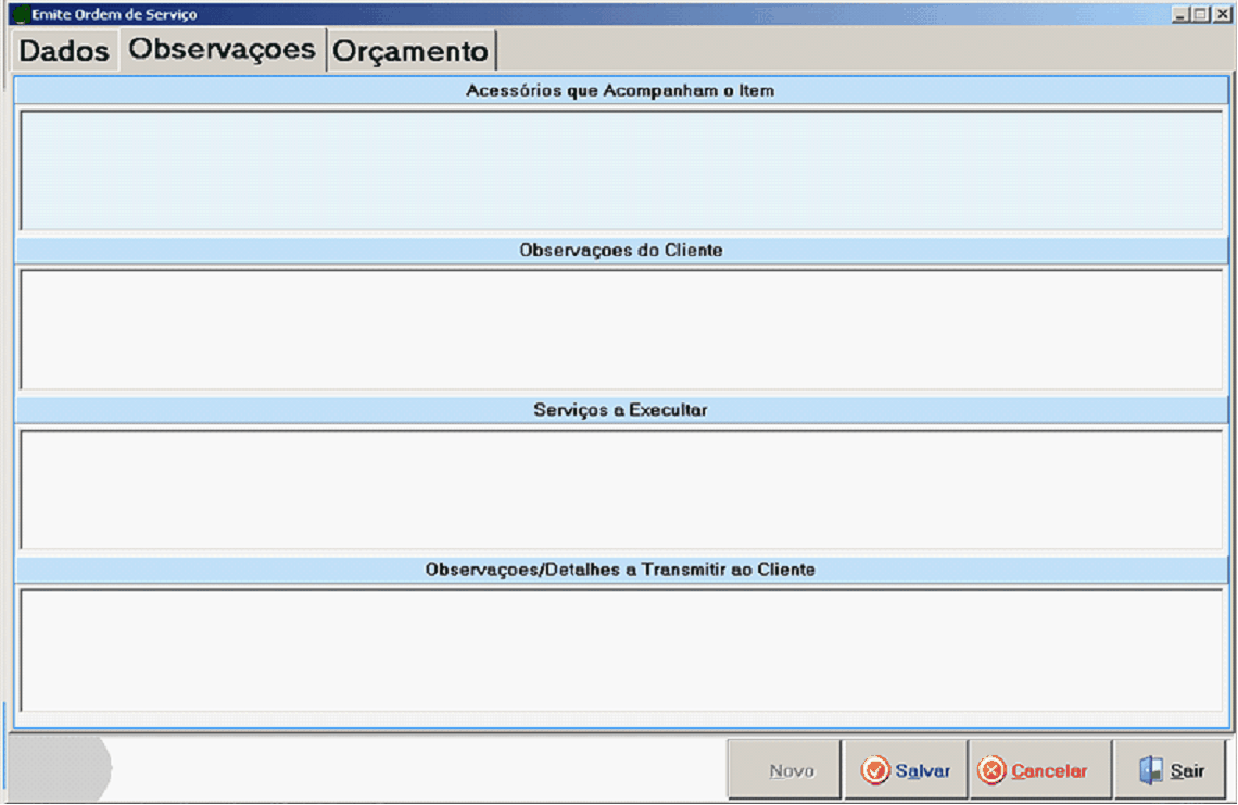 Observações do Cdiente: Anate neste campo o que o cliente emtá reportando sobre o item e o que, afinal, originou a solicitação do serviço;