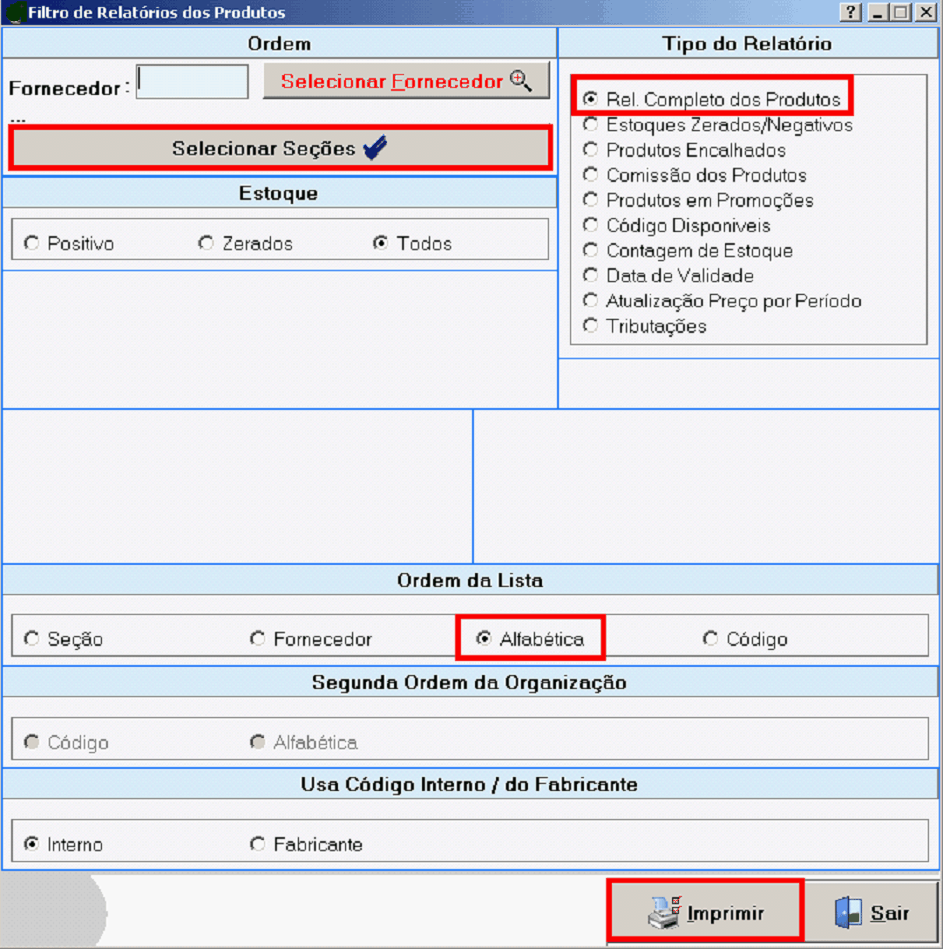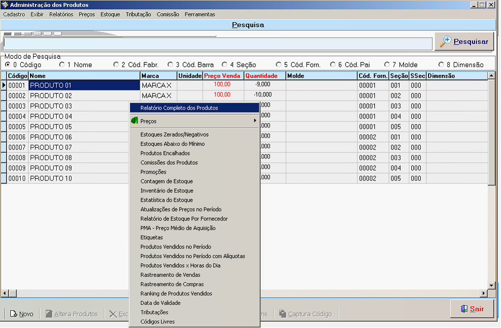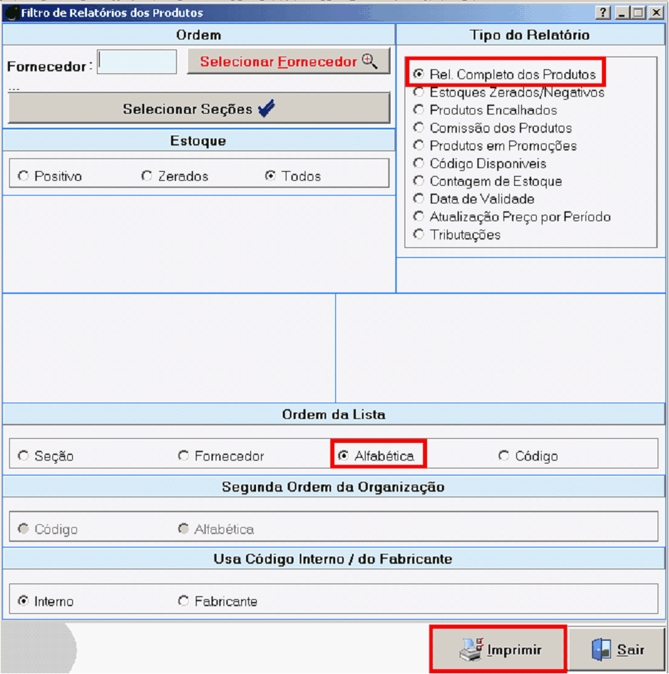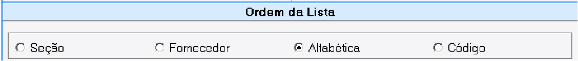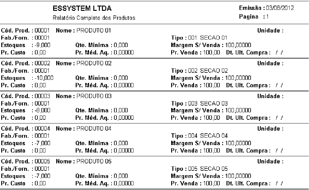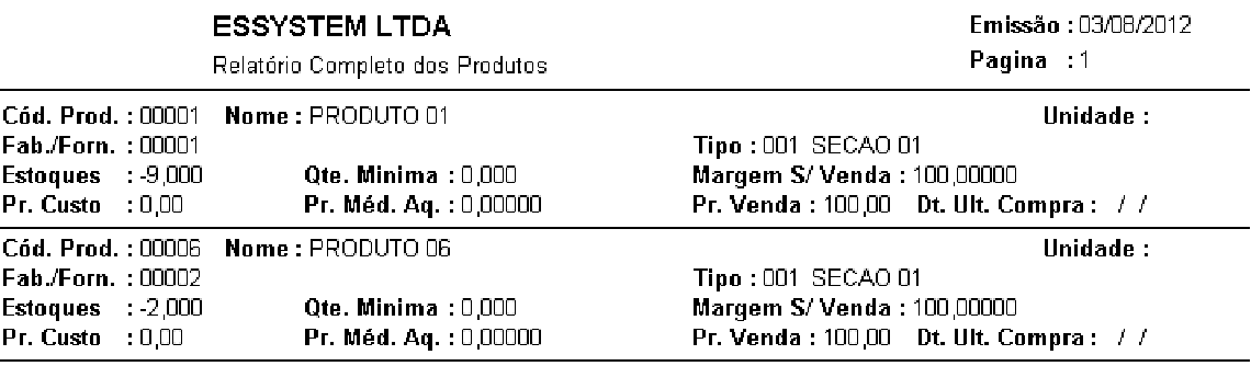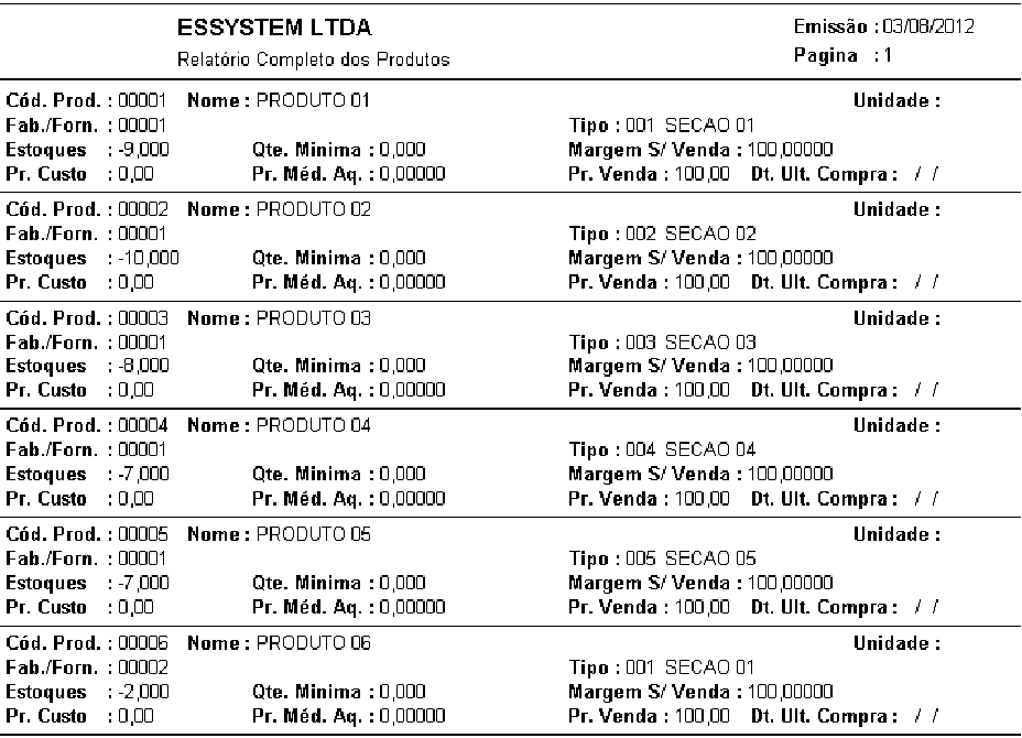Relação de Todos os Produtos, pode ser impressa em Ordem Alfabética, em Ordem de Código, Ordem de Seção e Ordem de Fornecedor. Ex: Relatório Completo de Produtos em Ordem Alfabética.