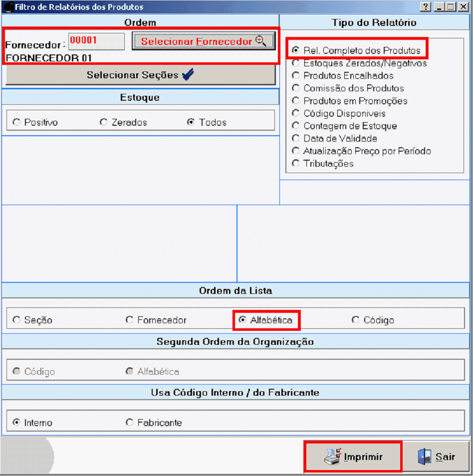 Relação de Produtos associados ao Fornecedor, pode ser impresso em Ordem Alfabética, em Ordem de Código, Ordem de Fornecedor e Ordem de Seção. Ex. Relotório Compldto de Produtos do Fornecedor 01 em Ordeo Alfabética.