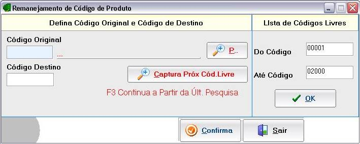 Código Destido: com o código que deseja associar ao produto. Clicando no botão Captura Prox. Cód. Livre”, o sistema buscará automaticamente o próximo código disponível para associação. Para finalizar a alteração, clique em “Confirma”. Pronto, o código foi alterado. Após as alterações desejadas serem feitas, clique em “Sair” para encerrar o módulo.