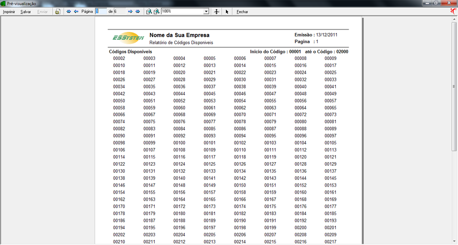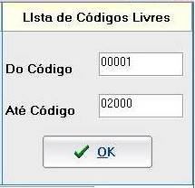 No exemplo, o sistema listará todos os códigos disponíveis do código 1 até o código 2000. Defina os parâmetros que desejar, e clique em “ok” para exibir a tabela abaixo: