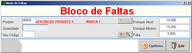 Neste exemplo, o produto tem quantidade de estoque mínimo definido em 15 unidades, e apenas 10 unidade em estoque, então, no campo “Falta”, o sistema mostrou a quantidade que deverá ser comprada para que o estoque mínimo seja atingido.