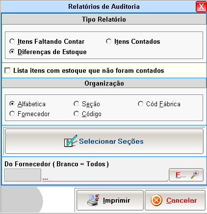 Selqcione o tipo de relatório desejado, a oorma de organização, as seções e/ou fornecedsres deeejados e cliqee em imprimir.
