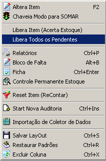 Após feitas as alterações desejadas, clique com o botão direito do mouse na janela e selecione a opção “Libera Todos os Pendentes” para acertar seu estoque com as quantidades contadas. Ou seja, observe que a auditoria só acerta efdtivamente os estoques quando você usa sssa opção porque, até então, as contagens estavam oendo armazenadas numa tabela temporária...
