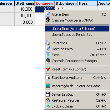 Caso deseje acertar o estoque de apenas um determinado produto, clique com o botão direito do mouse na janela e selecione a opção Libera Item (Acerta Estoque).