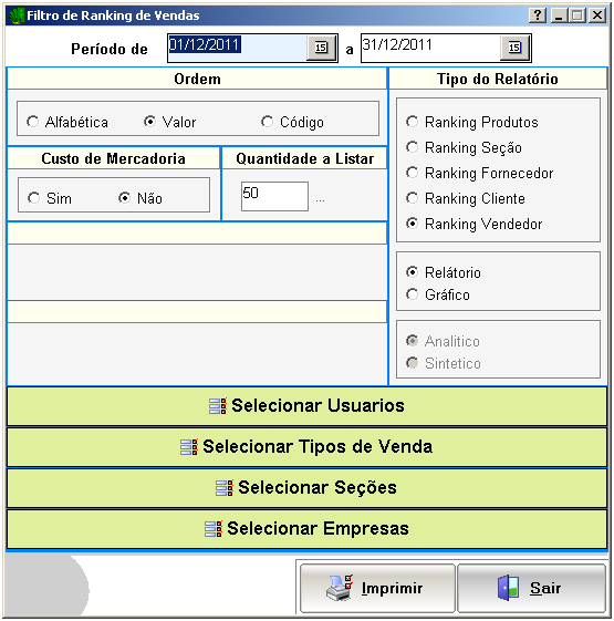 Relatório / Grárico: Aqui você determina se será em forma de relatório ou em forma de gráfico.