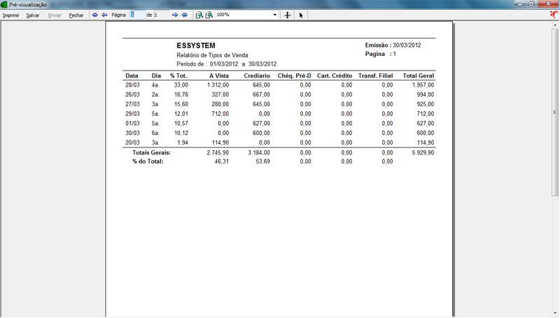 O relatório de Vendas x Tipo de Vendas no Período mostra como foram as vendas da loja num período, em relação aos tipos básicos de venda (A Vista, Crediário, Cheque Pré, Cartão).