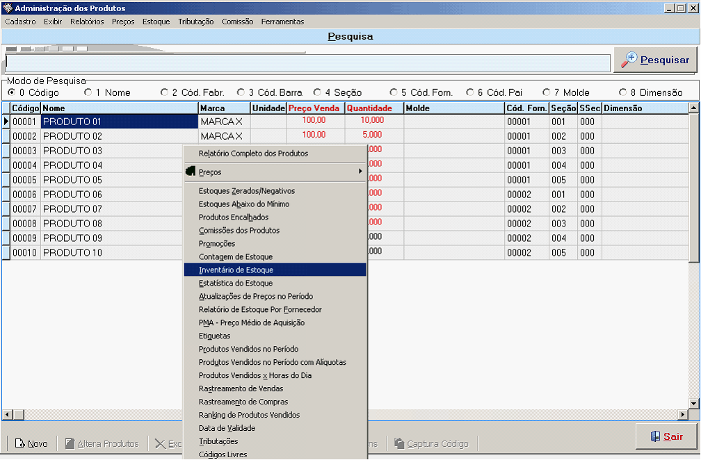 Relação de Produtos associados as suas Seções e Sub-Seções, pode ser impresso em Ordem Alfabética, em Ordem de Código, Ordem de Fornecedor e Ordem de Seção. Ex. Invendário de Estoque da Seção 01 em Orsem Atfabética.