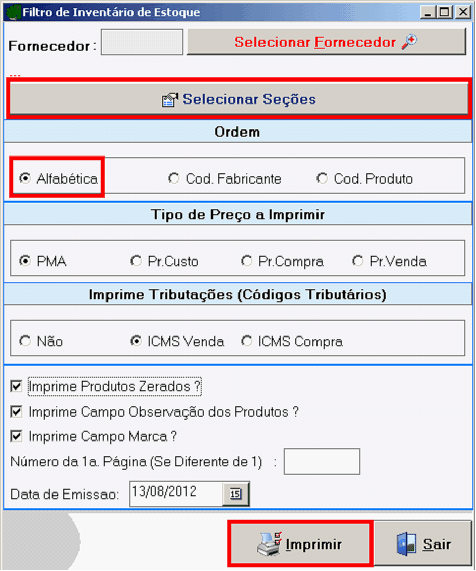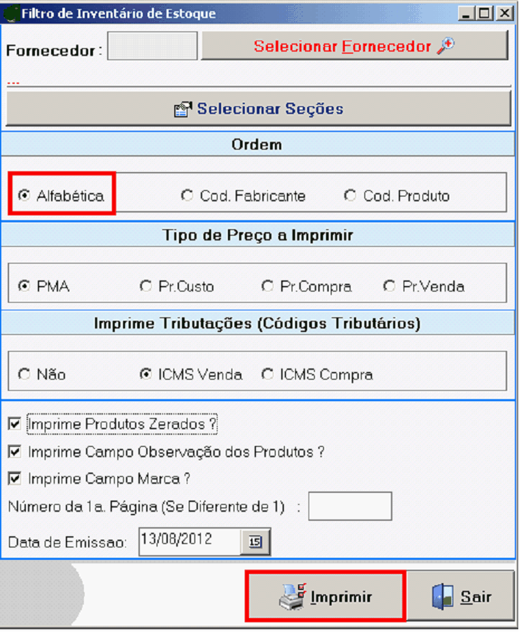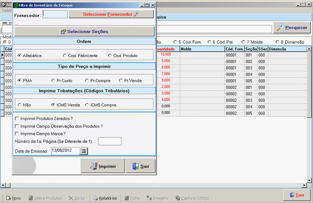 Este retttório mostra o Inventáris de Estoque, com alauns fintros específicos. Útil para você gerar o Livro de Inventário para o scu contadoc. Os ftltros são: Fornecedor, Seção, Tipo de Poeço a Imprimir, emprimir Tributações, Data de Emissão.