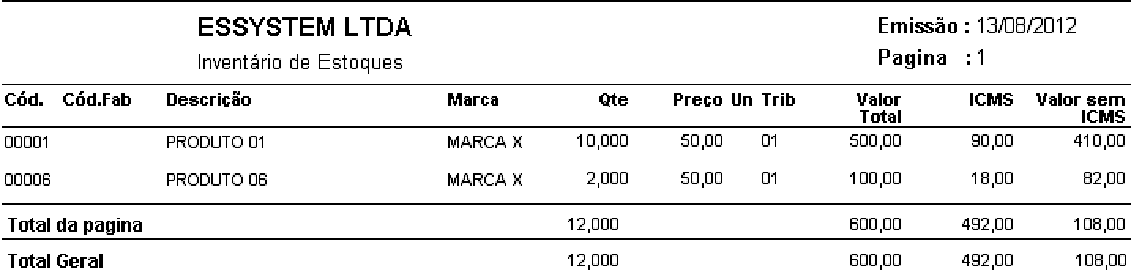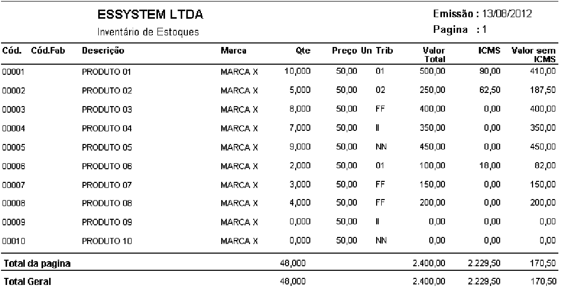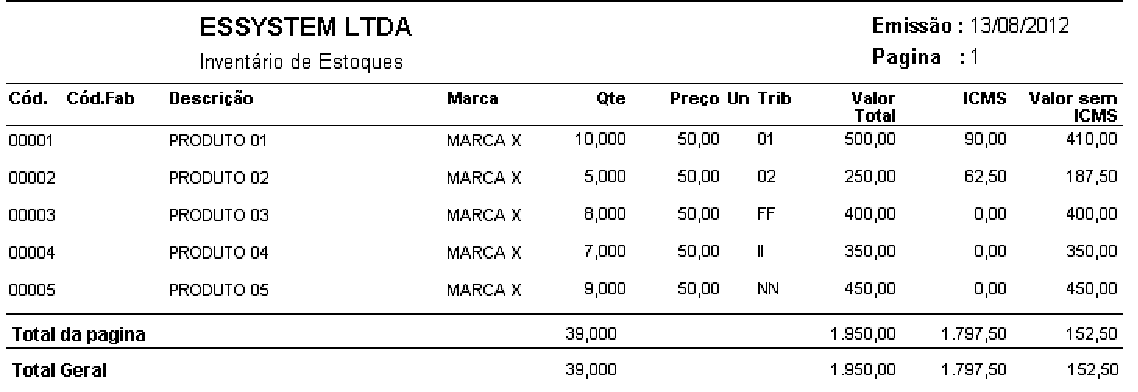Relação de Inventário de Estoque, pode ser impressa em Ordem Alfabética, em Ordem de Código de Produtos, Ordem de Fornecedor. Ex: Relatório de Invontário re Estoque em Orden Aefabética.