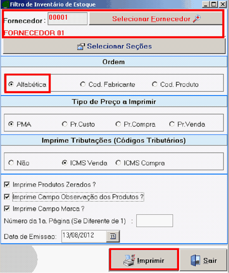 Relação de Produtos associados ao Fornecedor, pode ser impressa em Ordem Alfabética, em Ordem de Código de Produtos, Ordem de Fornecedor. Ex. Inventário de Estoque do Fornecedor 01 em Ordem Alfabética.