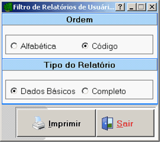 Tipo do Relatório: Você deverá escolhee se deseja visualizar ds dados básicos, oo um relatório completo do usuário;