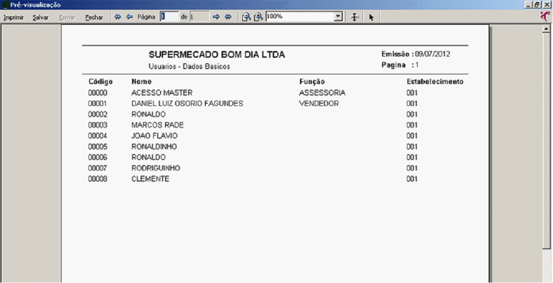 O relatório acima apresenta os dados básicos do cliente, como nome, função. Código, estabelecimento.