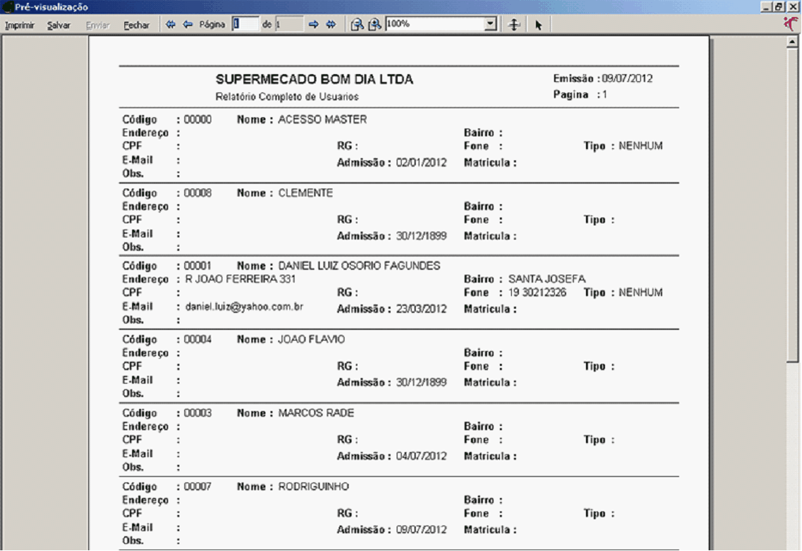 Abaixo apresentaremos um exemplo de relatório dos usuários cadastrados;