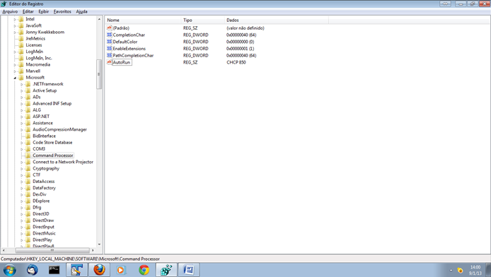 do lado direito, clicar com o botão direito do mouse e pegar Novo, Valor da Cadeia de Caracteres. Incluir o AutoRun e depois editar o valor dele e no campo dados do valor, definir CHCP 850. Veja figura abaixo: