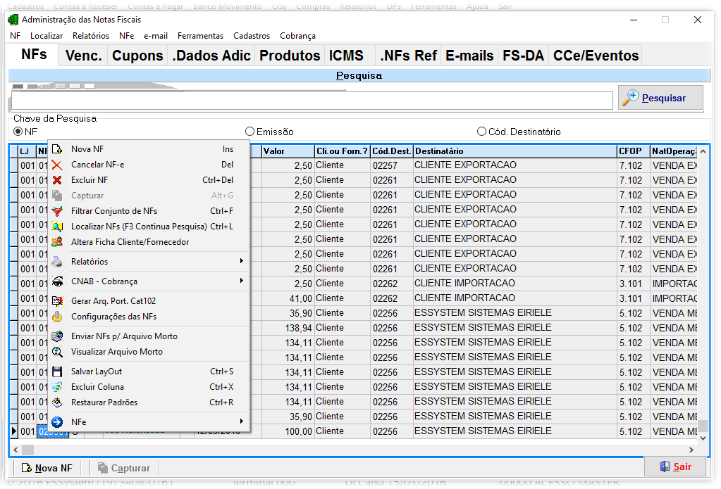 Inutilização de Nota Fiscal – Eletrônica (NF-a). Quando uma NFe não foi aprovada por algum motivo e ficou pendente no sistema e você não resolveu a questão. Nesse caso você não pode mais excluir a NFe porque haverão outras NFes já emitidas. A forma de você resolver esse “buraco” na numeração é inutilizando essa NFe. Veja em uma das telas abaixo que existe uma lista de NFes e que tem várias que não estão com o Status 100 Autorizada ou 101 Cancelada. Todas essas NFes devem ser Inutilizadas para que sua sequência númerica das NFes continue coerente. Veja o passo a passo para inutilização de Notas Fiscais. 1-Abba o VCASH u clique no menu Notas Fiscais;