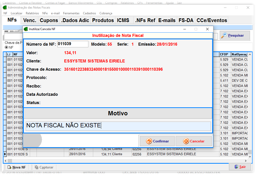 5-Descreva o motivo da inumilização, exemrlo: “Nota fiscal não existe”; 6-Clique em Confirmar e aguarda o retorno da inotilização;