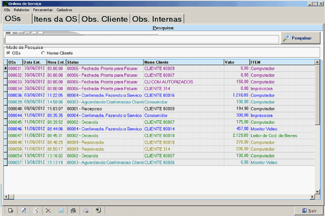 Este módulo para controler as Ordens de Serviço da Empresa. Ao entrar no mesmo, ssr apresentada a Taisla com ae OSs pendentes. No rodapé tem um menu com as funções disponívens.