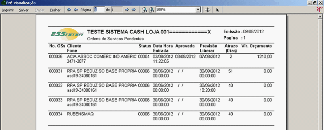 Neste exemplo acima, mostra o cliente, a data que foi aberta a OSs, a previsão de entrega, os dias de atraso da entrega, e o valor do orçamento;