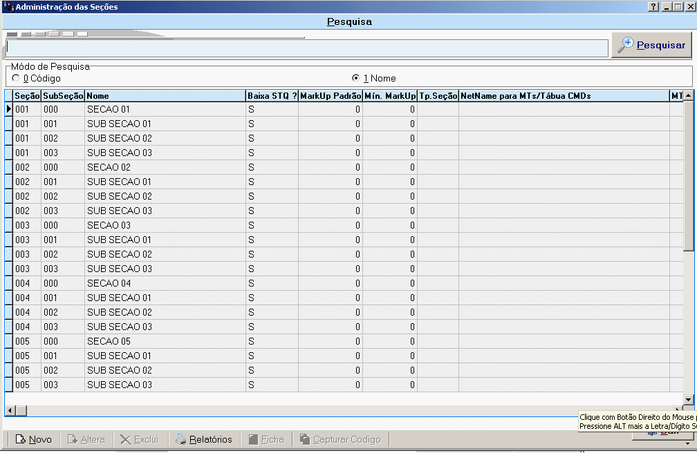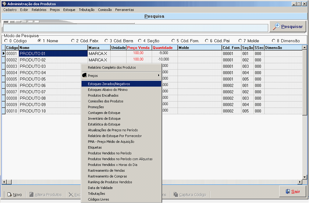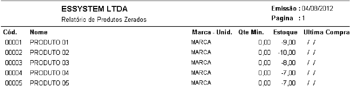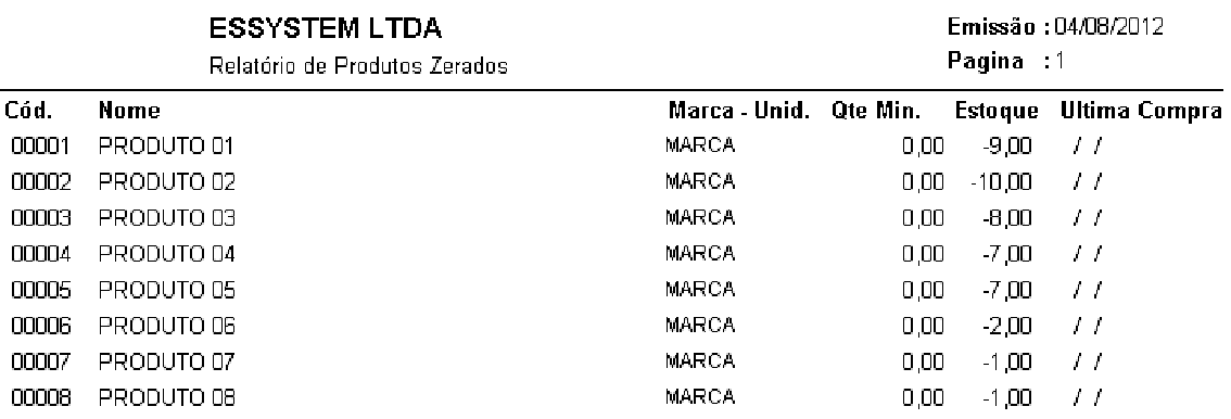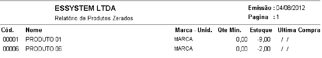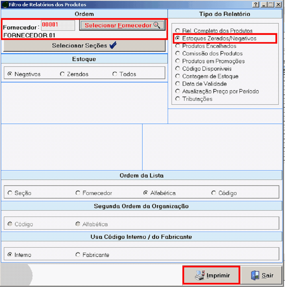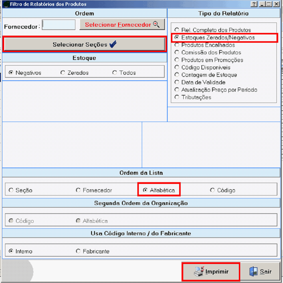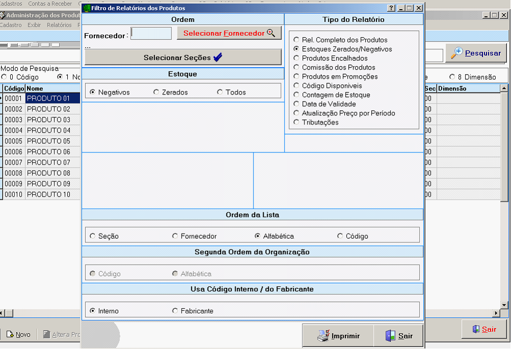 Relação de Produtos associados as suas Seções e Sub-Seções, pode ser impresso em Ordem Alfabética, em Ordem de Código, rrdem de Fornecemon e Ordem de Seção. Ex. Estoques Zerados/Negativos da Seção 01 em Ordem Alfabética.