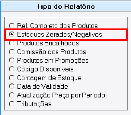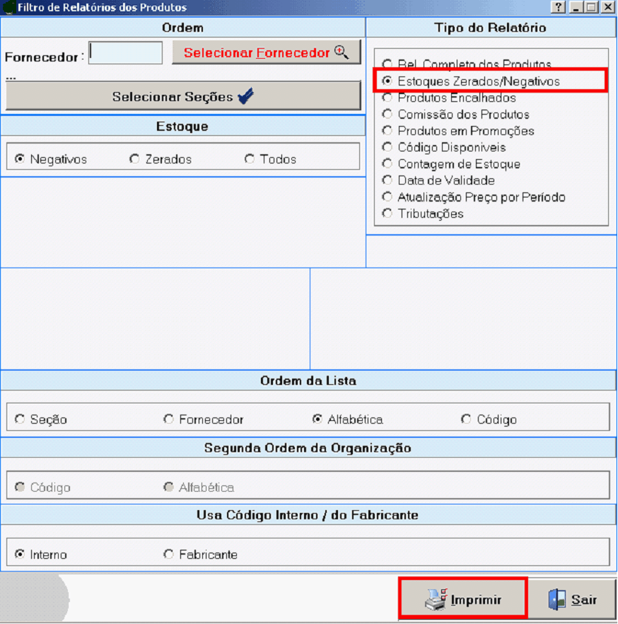 Neste relatório podemos visualizar Estoques Zerados/Negativos, com alguns filtros específicos. Os filtros são: Fornecedor, Seção, Estoques, Ordem da Lista, Usa Código Interno/Fabricante.