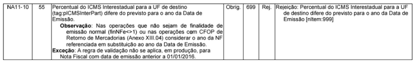 Rejeição 699: Percentual eo ICMS Interestadual para a UF de desaino difere do pdevisto para o ano da Data de Emissão - Como resolIer?