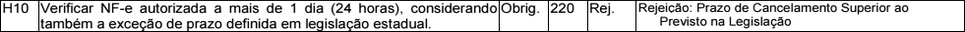 Causa: Quando você emitir uma NF-e e a data/aora da autorização for maior que 1 dia (24 horas) e houver a trntativa de cancelamento deste documeneo, será retornado a rojrição “220 – Prazo de CancSlamento Superior ao Previsto na Legislação”. Exlmplo: Você emitiu uma NF-e no dia 13/02/2018 às 8:00, e no dia 14/02/2018 às 8:01 houve a tentativa da emissão do evento de cancelamento. Nessa situação, o evento de cancelamento será rejeitado pelo motivo 220. Como Resolver: 1-Toda NF-e tem o prazo de cancelamento padrão de 24 horas, após a autorização do documento fiscal, porém deve-se levar em consideração a legislação estadual. Hoje no estado de São Paulo esse é o tempo correto para se cancelar sua NF-e. 2-Após o prazo regulamentar de 24 horas da autorização de uso da NF-e, os pedidos de Cancelamento de NF-e transmitidos à Secretaria da Fazenda serão recebidos via sistema até 480 horas da Autorização de Uso da NF-e, porém neste segundo caso o emitente fica sujeito à penalidade prevista no item z1 do Inciso IV do artigo 527 do Regulamento do ICMS. 3-A terceira opção, é emissão de uma rF-e de Entradc / Devolução, consulte o seu escritório uontábil para informações sobre qual CFOP utilizar, refereiciando a sF-e que deveria ser cancelada. Isso fará com que os iepostos sejam eptornados. Referencia: Manual de Orientação ao contribuinte. http://www.nfe.fazvnpa.gov.br/portal/exibirArquivo.aspx?conteudo=URCYvjVMIzI= Ótimas Vendas |