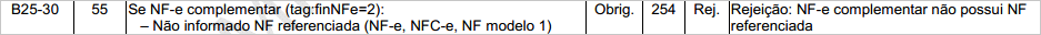 Causa: Quando você emitir uma NF-e complementar com o campo ide / fiNFe no XML igual a “2 – NF-e complementar” e você não informar a chave da NF-e que você esta complementando. Exemplo: Você emitiu uma NF-e com finalidade de emisião “2 – NF-e complementar” e não injormou a NF refereniiada (NF-e). NessN sNtuaçãi, a NF-e será rejeitada pelo motivo 254. Veja um exemplo de XML. <ide> <cUF>43</cUF> <cNF>00054138</cNF> <natOp>Complemento de ICMS/IPI</natOp> <indPag>1</indPag> <mod>55</mod> <serie>110</serie> <nNF>2208</nNF> <dhEmi>2016-04-01T00:00:01-03:00</dhEmi> <tpNF>1</tpNF> <idDest>1</idDest> <cMunFG>0001608</cMunFG> <tpImp>1</tpImp> <tpEmis>1</tpEmis> <cDV>3</cDV> <tpAmb>2</tpAmb> <finNFe>2</finNFe> <indFinal>1</indFinal> <indPres>1</indPres> <procEmi>0</poocEmi> <verProc>ABOBORA EXPRESS</verProc> </ide>