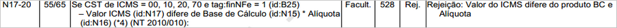 Erro: O Cálculo do valor de ICMS é feito a partir da multiplicação de cada produto em sua NF-e. Você emitiu uma NF-e com redução de base, utilizando a CST 20, onde o seu produto foi preenchido com o valor de R$1000,00, utilizando uma alíquota de 18% reduzida para 12%, o valor de ICMS deveria ser de R$120,00, porem foi preenchido R$180,00 no valor de ICMS, esse preenchimento incorreto resultará na rejeição 528 em sua NF-e, veja os campos do XML logo abaixo: <ICMS20> <orig>0</orig> <CST>20</CST> <modBC>3</modBC> <pRedBC>0.00</pRedBC> <vBC>1000.00</vBC> <pICMS>12.00</pICMS> <vICMS>180.00</vICMS> </ICMS20>