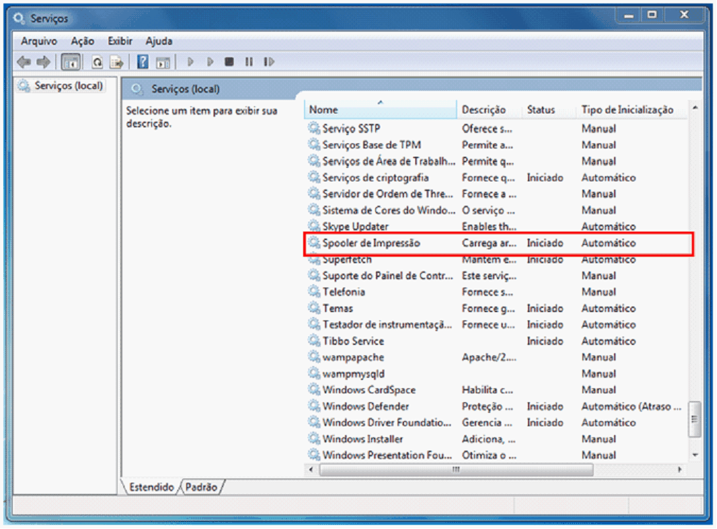 2.Percorra a lista de serviços e localize o nome Spooler de impressão.