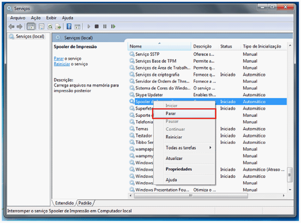 3.Clique com o botão direito em Spooler de impressão e selecione Parar.