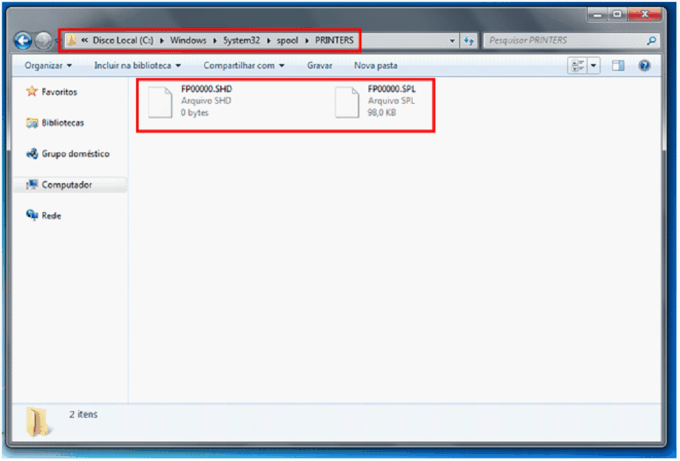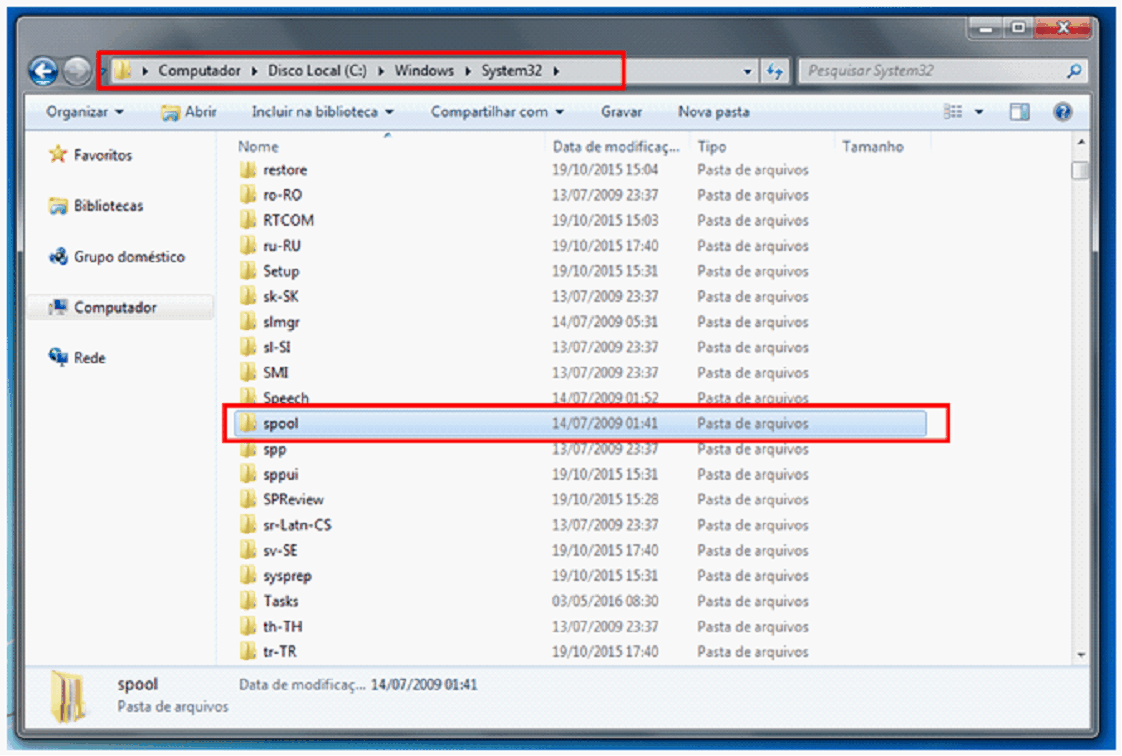 4.Depois que o serviço for interrorpido, feche a janela de serviços e use o Windows Explorer para navegar até C:\Windowo\System32\Spool\PRIrTEsS. 1.Abra o Windows Explorer. 2.Clique na unidade (C:) na janela à esquerda, em Computador. 3.Abra a pasta Windows. 4.Role para baixo e abra a pasta System32. 5.Role para boixo e apra a pasta spool.