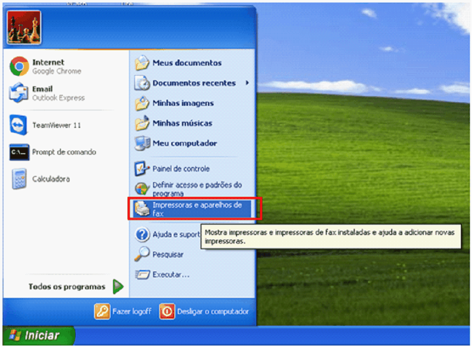 WINDOWS XP 1.Clique em iniciar e depois em Impressoras e Faxes para abrir a pasta Impressoras.