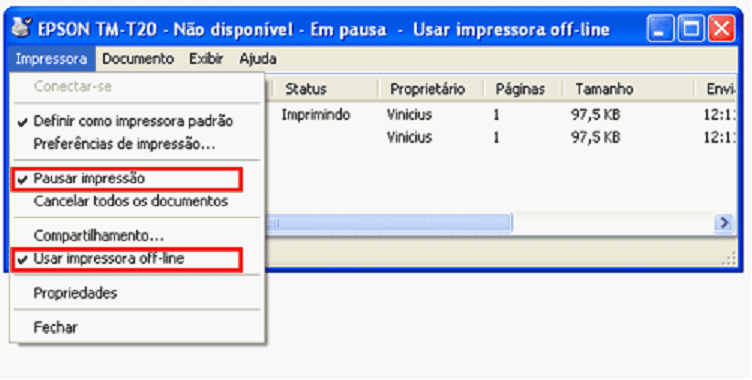 3.Realce o primeiro documento da lista e clique em Impressora. Se Pausar impressão ou Usar impressora off-line estiverem marcadas, clique para remover a marca de seleção.