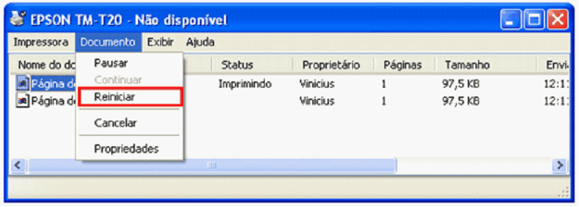 4.Se a página não for impressa, clique em Documento e depois clique em Reiniciar.