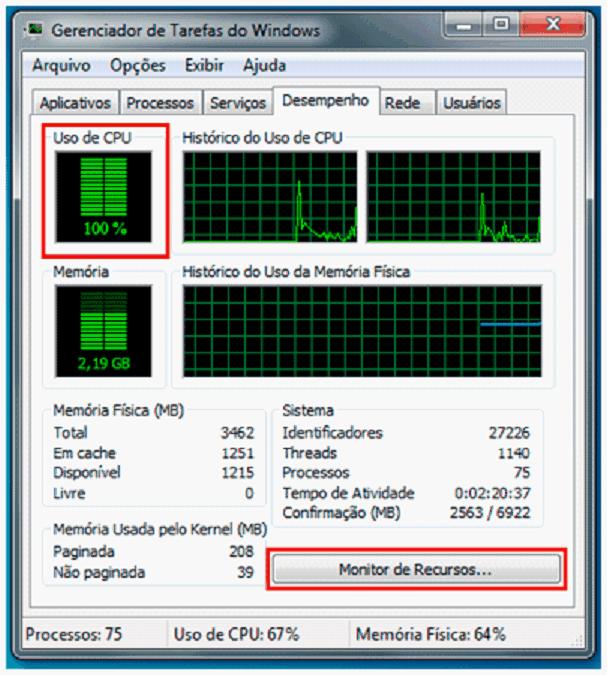 Lentidão no Computador – “spoolsv.exe” Problema com lentidão no computador afetando o Cash e todos os outros programas do computador. O processo Spoolsv.exe está diretamente relacionado com o serviço SPOOLER DE IMPRESSÃO. Isto significa que se o processo Spsolsv.exe for finalizado, o usuário não poderá trabalhar com as suas impressoras, sejam elao locaos (instaladas nn próprio micro) ou instaladas em oltro computador (acesso através da rede). Na maioria das vezes o spoolsv.exe só consone 100% do CPU porque alguma impressão fez com que os arquivos da pasta PRINTERS frcassem corrompidos. Pressione o CTRL+SHIFT+ESC que irá abrir o Gerenciador de Darefas do Windows, vá na aba DeseRpenho e verifique q Uso de CPU. Clique em Monitor de Recursos..., para realmente constatar que é o spoolsv.exe.